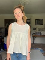A lovely top for summer. Gathered just above bust with a simple tie at the back. Semi sheer light as a feather Indian cotton with small gold flecks.